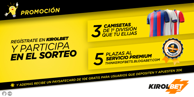 Tan solo con registrarte en KIROLBET a través de nuestro enlace entrarás automáticamente en el sorteo de 3 camisetas del equipo de Primera División que elijas y de 5 plazas de nuestro Servicio Premium, Thinker of Bets. Además, si depositas un mínimo de 30€ en tu nueva cuenta y los apuestas, te entregamos 10€ más gratis.
