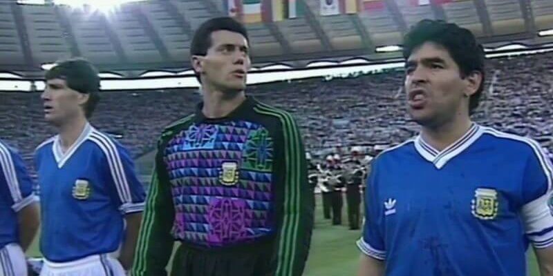 El 4 de Julio del 90, el destino quiso que Maradona defendiera los colores de su Nación, en su nuevo hogar, frente al autentico anfitrión Italia. Durante la representación de los Himnos vimos a un Diego desencajado al ver como sus amados seguidores se volvían en contra de lo que el más amaba pitando la melodía argentina.