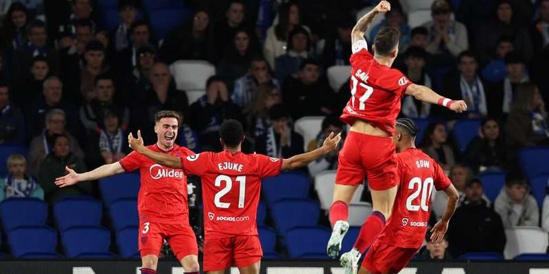 Celebración de varios jugadores sevillistas del tanto de Ejuke en Anoeta (Foto: flashcore.es)