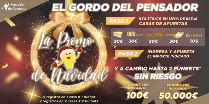 Si te registras en 1 casa de apuestas, tendrás acceso a 1 funbet sin riesgo de 20€, puediendo escoger entre la funbet de 100€ (muy buen premio de lotería) o la de 50.000€ (el verdadero Gordo de Navidad).