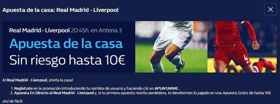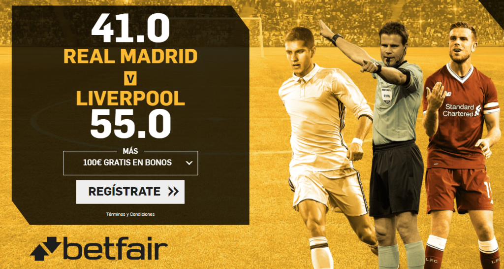 La victoria del Real Madrid a 41.0 y la del Liverpool FC 55.0. Apuesta máxima de 1€. Solo válido para nuevos usuarios que se registren ahora pulsando en la imagen que encontrarás a continuación