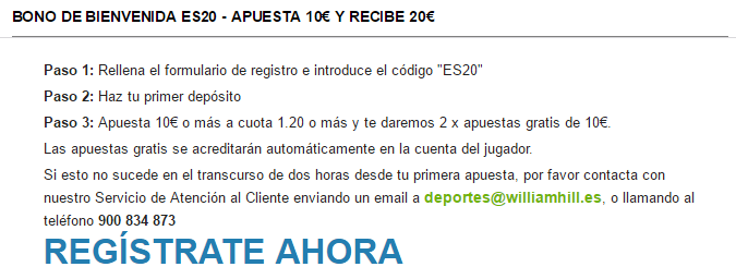 – Las personas residentes en Latinoamérica pueden participar con las mismas condiciones que los residentes en España, con la única diferencia de que deben introducir el código de bono «20POR10» y deben realizar el registro en William Hill a través de este enlace: