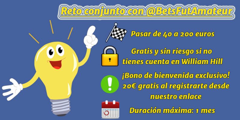Para no excluir a nadie, ofrecemos como alternativa realizar un pago previo de 20€ para inscribirse, pero realmente el reto está pensado para aquellos que no tengan cuenta en William Hill. ¡OJO! En este caso, de perderse el reto, no se devolverían ni los 20€ pagados para apuntarse ni los 60€ que serán necesarios para seguir el reto correctamente (los nuevos usuarios cuentan con la ventaja de que solo tienen que introducir 40€ y recibirán 20 gratis gracias a nuestro bono de bienvenida exclusivo). Como compensación, si se da esta circunstancia, si el reto termina mal, sortearemos entre todos los que se apunten mediante este método 10 plazas de un mes de nuestro servicio Premium, Thinker of Bets, valorada cada una de ellas en 42€.
