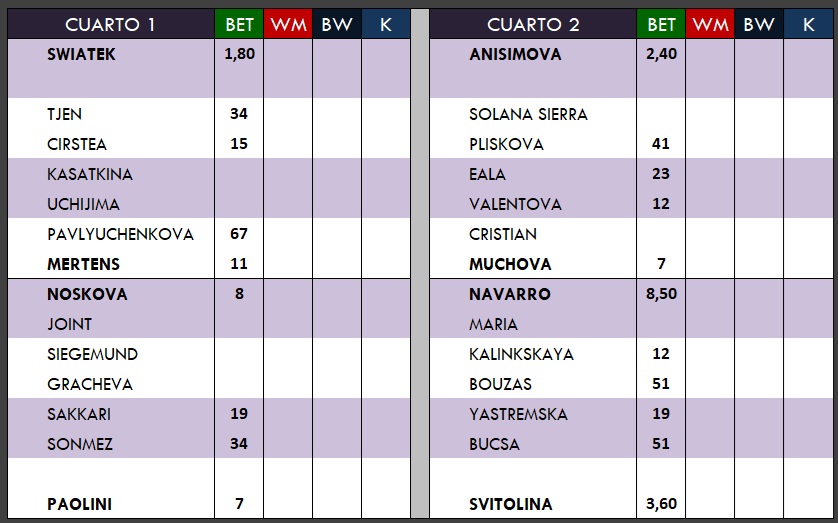 La rival que más miedo me podría dar es Cirstea, pero habrá que ver cómo gestiona el título de la semana pasada en Cluj y el salto inmediato a un torneo grande, sobre todo en energía, foco y físico. A partir de ahí, el resto de nombres del cuarto no me generan una amenaza real para Swiatek. Mertens suele cumplir cuando es superior, pero contra la élite normalmente se queda corta. Noskova arranca con una primera ronda incómoda ante Joint. Paolini no tiene un estilo que incomode especialmente a Iga, con un H2H muy favorable (6–1).