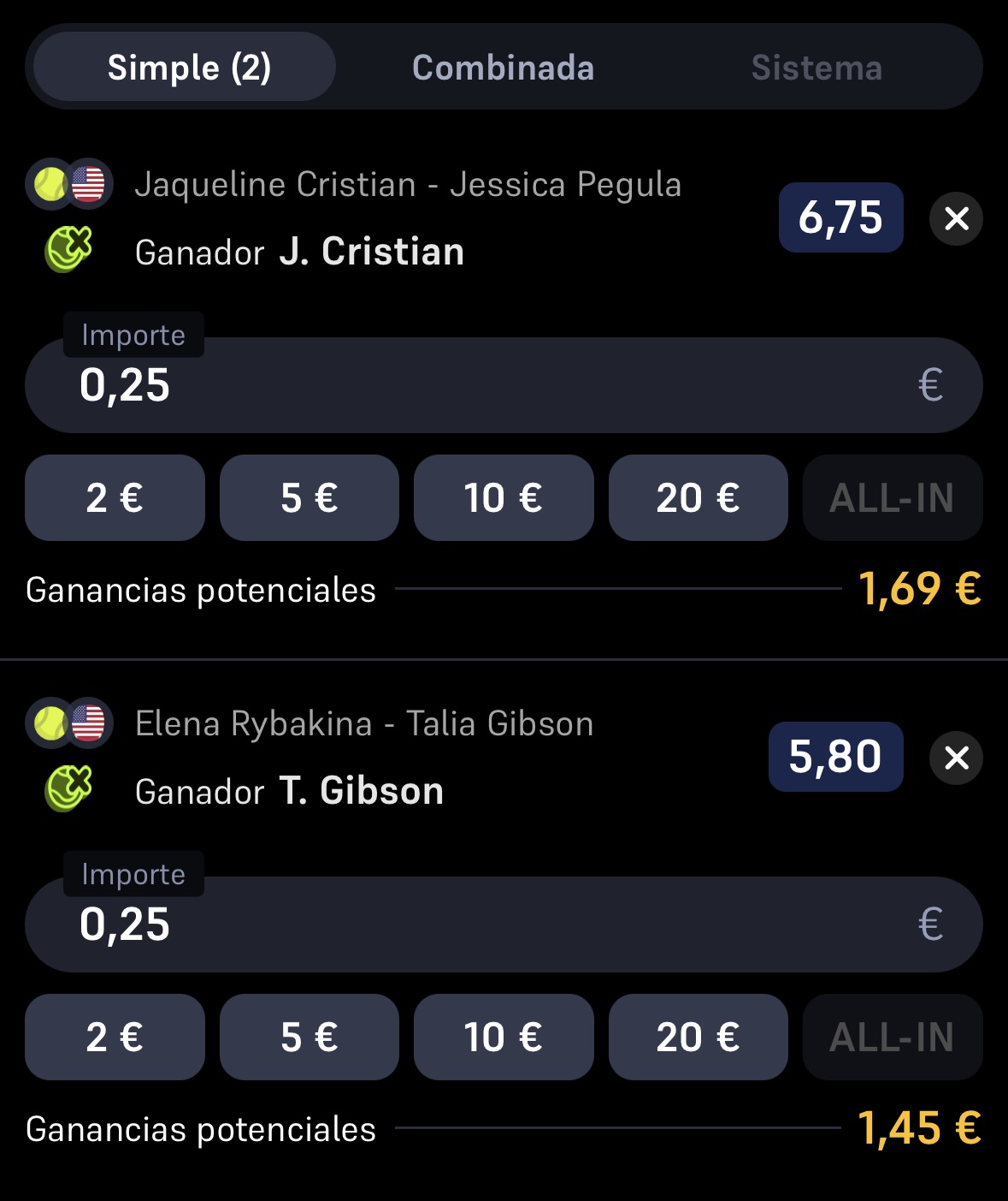 Al llegar Rybakina y Pegula a octavos de final y partir claramente como favoritas, hacemos estas 2 apuestas de cobertura que contarán evidentemente para las estadísticas.